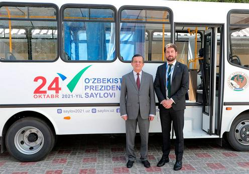 Ўзбекистон МСК раиси Зайниддин Низамходжаев ва ДИИҲБ миссияси раҳбари Оуэн Мерфи мобил сайлов участкаси олдида. Ўзбекистон МСК матбуот хизмати фотосурати