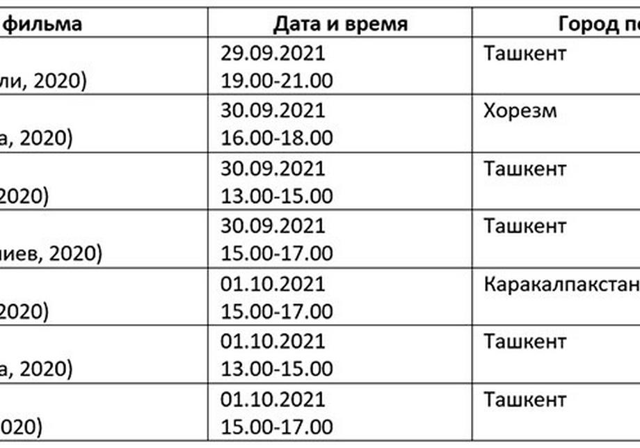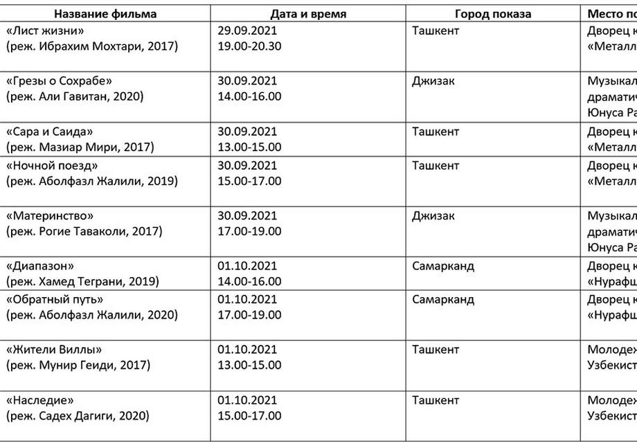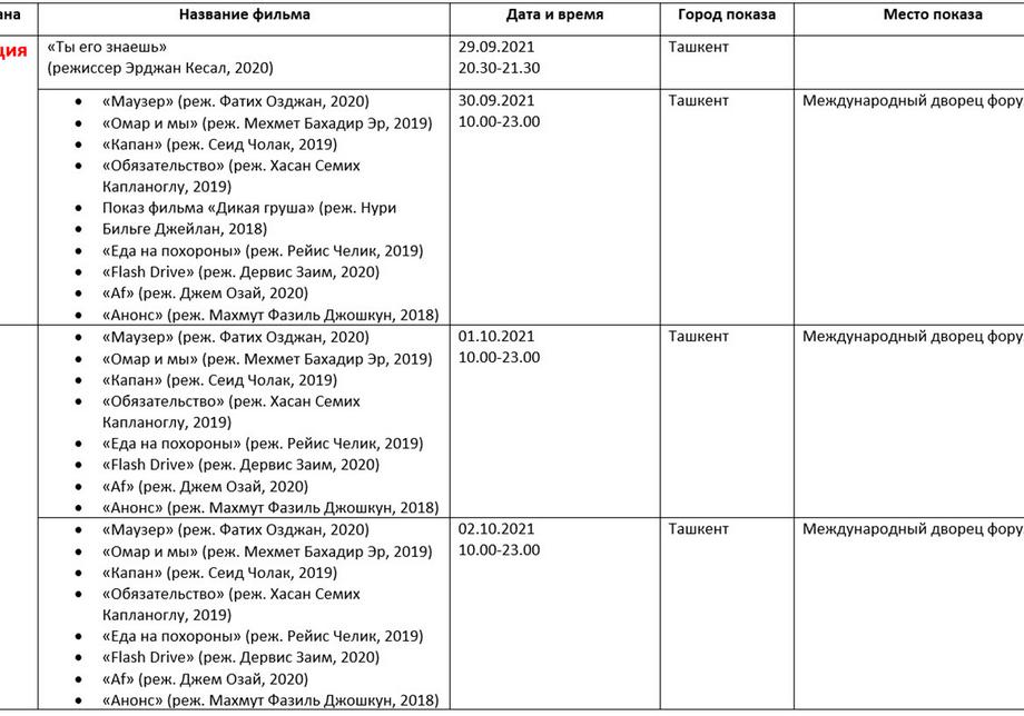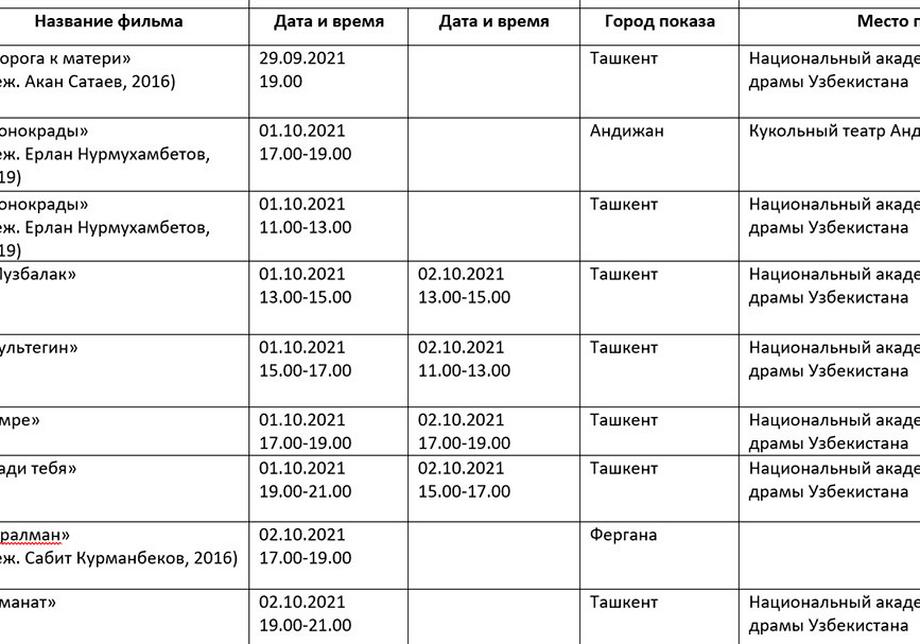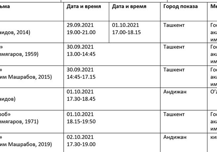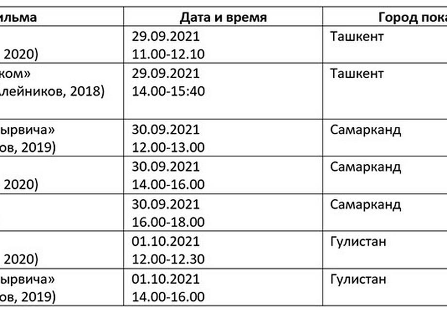 Қуйида кинофорум ташкилотчилари тақдим этган дастур билан таништирамиз. Унда Ўзбекистон ва Ҳиндистон кино кунлари берилмаган.