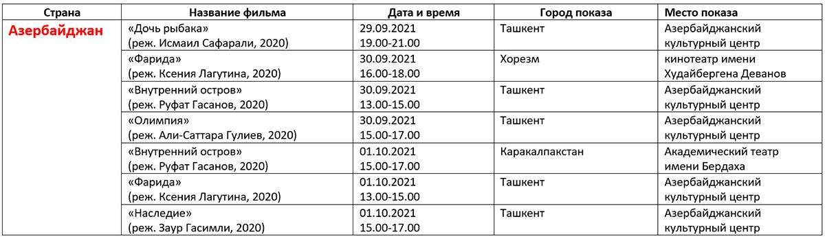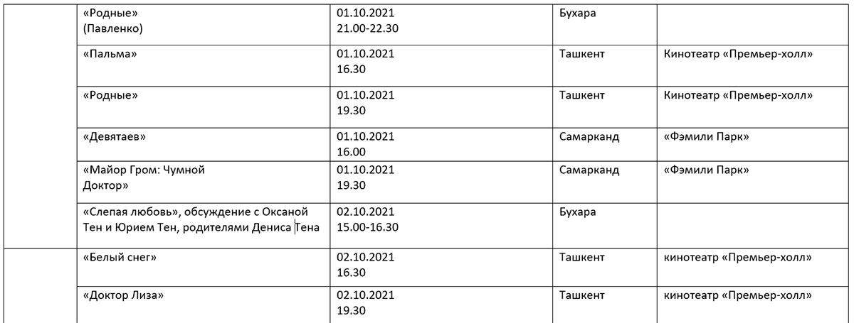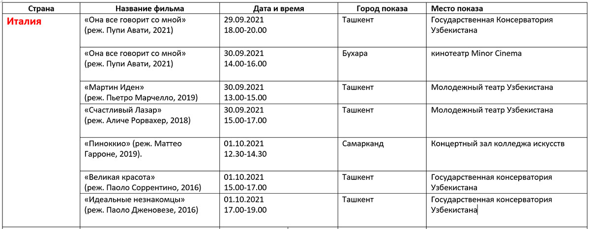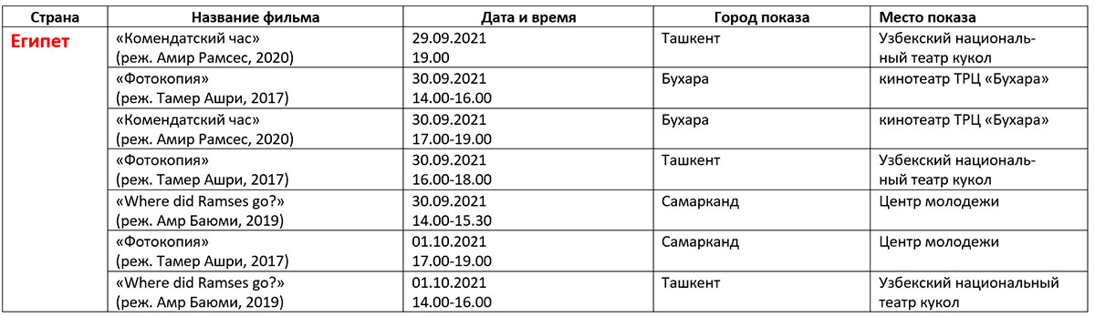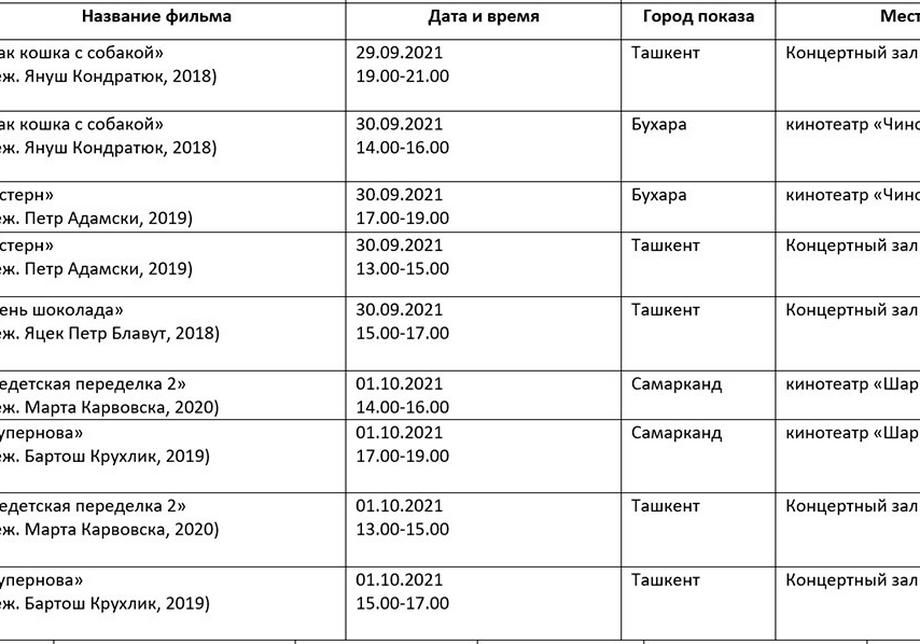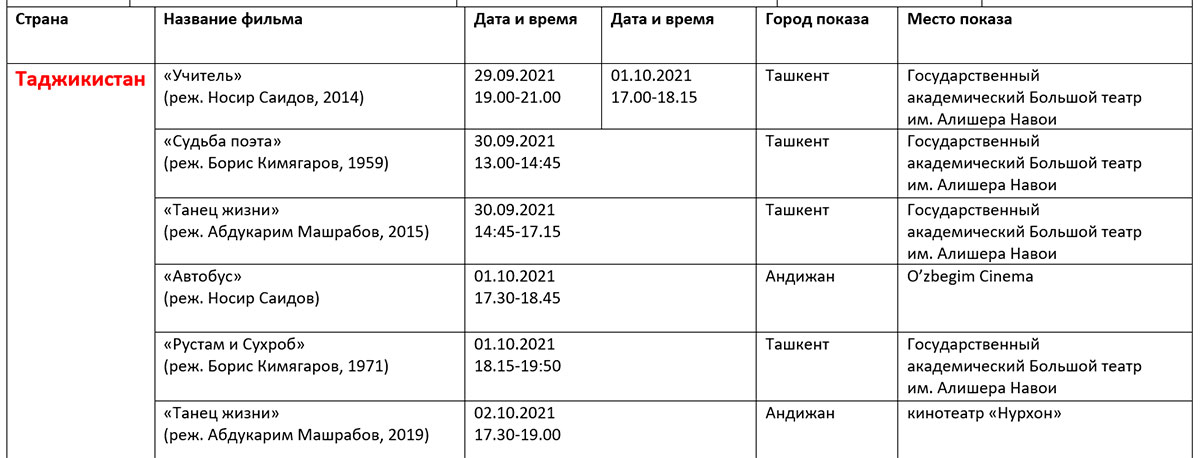 Қуйида кинофорум ташкилотчилари тақдим этган дастур билан таништирамиз. Унда Ўзбекистон ва Ҳиндистон кино кунлари берилмаган.