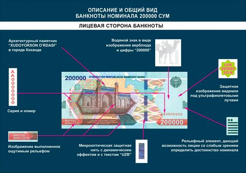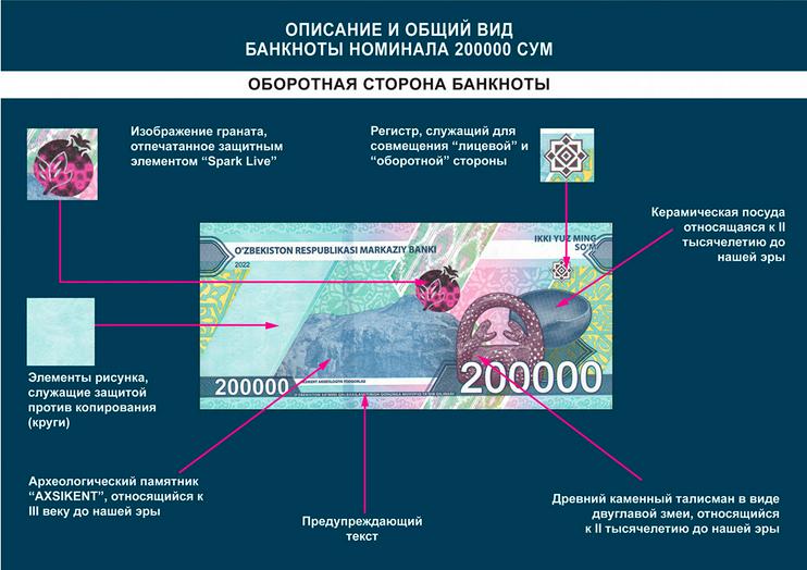 Ўзбекистон Республикаси Марказий банки 2022 йилнинг 15 июлидан бошлаб янги кўринишдаги номинал қиймати 200 000 ($18,3) сўм бўлган банкнот шаклида пул белгиларини муомалага чиқариш тўғрисида қарор қабул қилди. Бу ҳақда Марказий банк матбуот хизмати хабар беради.