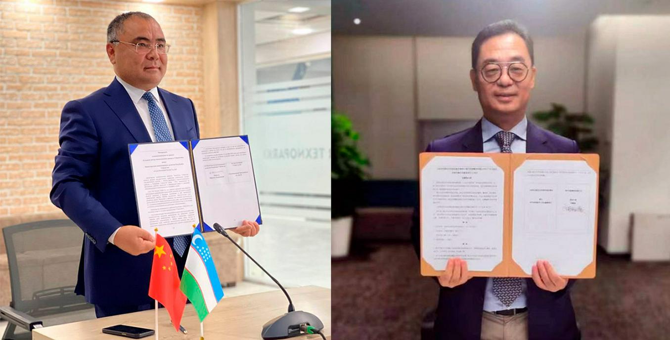 ИННОВАЦИОН РИВОЖЛАНИШ ВАЗИРИ ИБРОҲИМ АБДУРАҲМОНОВ ВА LUYE INVESTMENT GROUP CO., LTD РАИСИ ЛЮ ДЯНЬБО. ВАЗИРЛИК МАТБУОТ ХИЗМАТИ ФОТОСУРАТЛАРИДАН КОЛЛАЖ